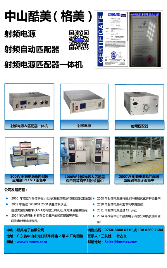 中山市酷美電子有限公司是一家專(zhuān)業(yè)從事半導(dǎo)體制造設(shè)備研發(fā)、設(shè)計(jì)和制造的高科技合資企業(yè)。產(chǎn)品主要有射頻電源、射頻自動(dòng)匹配器、射頻功率分配器,廣泛用于太陽(yáng)能光伏系統(tǒng)、PECVD、真空鍍鏌、刻蝕等真空設(shè)備當(dāng)中。公司于2000年進(jìn)入半導(dǎo)體領(lǐng)域,已有15年豐富的行業(yè)經(jīng)驗(yàn)。2002年,成為全球最大的半導(dǎo)體設(shè)備制造商AMAT(美國(guó)應(yīng)用材料公司APPLIED MATERIALS INC)認(rèn)證的供應(yīng)商,并為AMAT大批量制造射頻匹配器等產(chǎn)品,每年DMR比率控制在1%之內(nèi)。